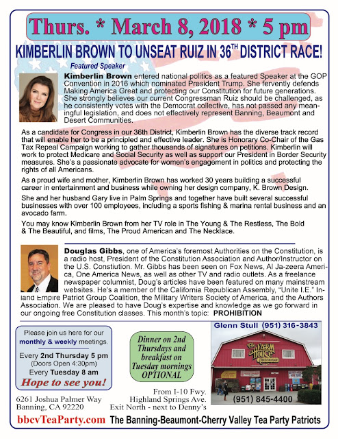 Join me in Banning, Tonight. I will be giving a presentation regarding the Constitution during the second hour, during the first hour of the Tea Party meeting Kimberlin Brown Pelzer who is running for congress will be speaking. There will be no Constitution Class in Temecula.