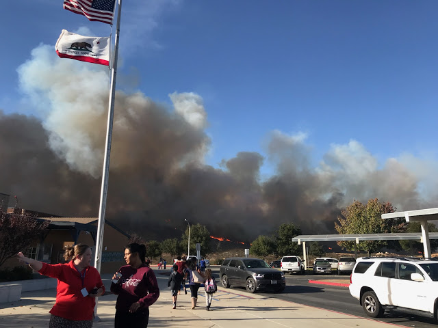 Last December, before school let out for Christmas Vacation (that’s right, I called it by its proper name), we had a fire licking the hills near our house, and it got literally across the street from the school three of my grandchildren attend. My son had to go pick up his kids early, due to the heavy dose of smoke in the air, and he took the following snapshot: