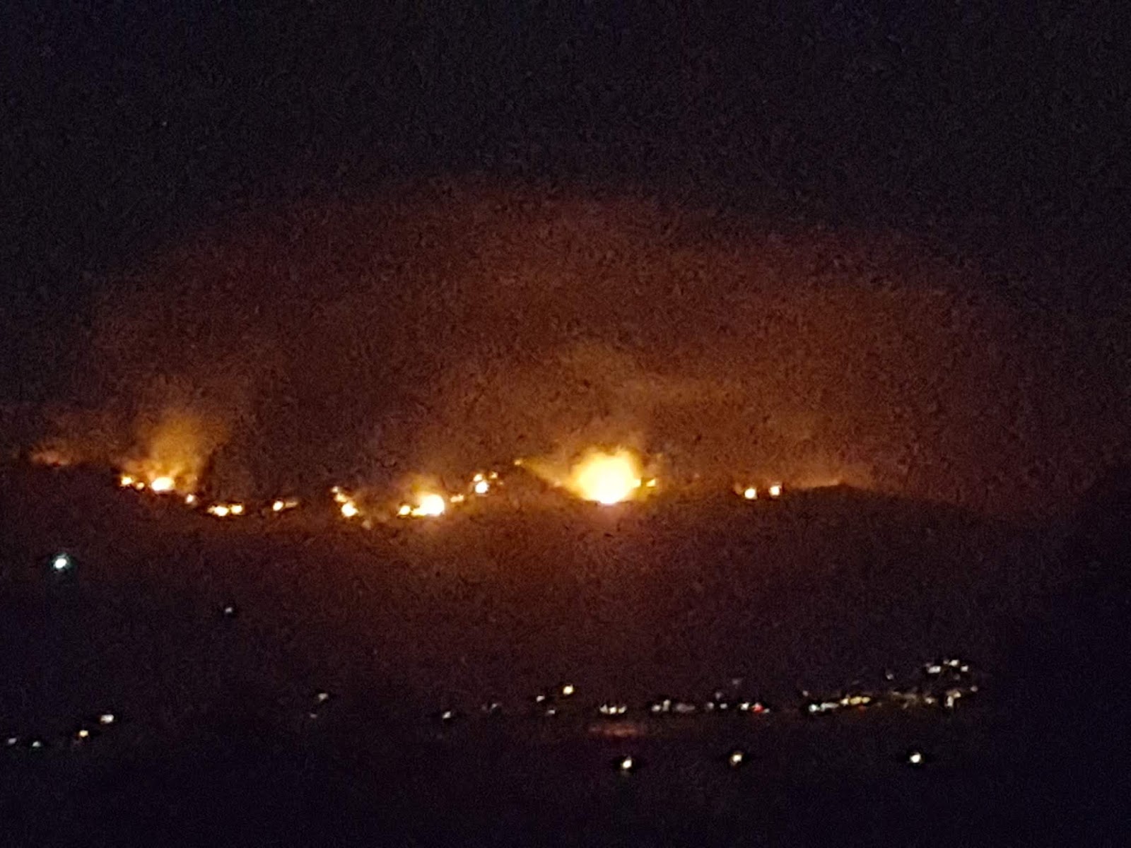 Last night, as I traveled south along the I-15 from beyond the 91 Freeway in Corona, through the Temescal Valley, I noticed a fire that has been burning in the Saddleback area of Orange County had made its way over the hills and was marching down the fuel rich Cleveland National Forest towards homes in Temescal Valley and the northern end of Lake Elsinore. Here’s the pictures I pulled over to the side of the road to take: