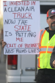 Then, in 2011, California passed a new emissions standard for the trucking industry.  Smaller companies could not afford the twenty-five thousand dollars per truck upgrade, and they closed their doors.  The larger corporations gobbled up the new customers suddenly searching for a new trucking service, since theirs had gone out of business because of the new law.  Many “owner-operators,” the independent contractors of the trucking industry, also went out of business, also because they could not afford the cost of the upgrade.  Some of them went to the larger corporations as driver-employees (a tough endeavor since suddenly the market was flooded with unemployed drivers seeking employment as a result of the law), while the rest of the negatively influenced drivers either retired, changed professions more often than not to something that made them less money, or took their small trucking business to another State.  Meanwhile, the larger corporations absorbed the new work available, and padded their pocketbooks with more money since there were now less smaller companies to compete with.  Meanwhile, for those of us who survived the onslaught of the Democrat emissions law-making madness, we came under strict scrutiny by the bureaucrats in Sacramento who know nothing about the industry.  At one time, because he kept setting off the emissions alarm on his truck (something that was added to big rigs as a result of the new law), a friend of mine was chastised by an “inspector” from Sacramento for driving uphill so much to make his deliveries, because uphill driving while fully loaded increases the truck’s emission of pollutants, and that would not be tolerated.
