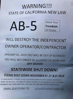 After all of the dust clears the real loser will be the State of California.  As a result of A.B.-5, California will lose product movement, product supply, and a large segment of the tax-paying population who will be forced into poverty, or into abandoning the State they otherwise loved.  And, many of those people are married, so their spouses who may hold jobs in California will also leave, as well, doubling the damage to workforce numbers.  Without enough workers, and with the increase in the cost of doing business, along with those departing independent contractors a number of companies will move out of California, too.  Why would they remain in a State set on eliminating their preferred method of doing business with independent contractors, or shooing away the population of employees?