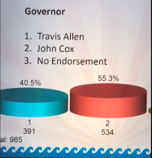 In today’s vote regarding endorsement of the gubernatorial candidates, the first vote regarding endorsement had John Cox at 55.3% and Travis Allen at 40.5%.  60% is needed for endorsement.