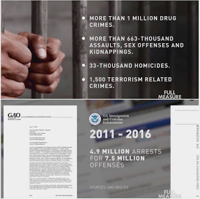 –“And the number of illegal immigrants committing serious crimes in the U.S. is staggering in terms of scope and cost. According to the newest figures from the Government Accountability Office: one in five federal prison inmates are criminal aliens. The vast majority of them—91%— are from Mexico, Honduras, El Salvador, Guatemala, Colombia and Dominican Republic. A Full Measure analysis of government figures finds: Over six years, more than 730-thousand criminal aliens were in U.S. prisons or local jails. They accounted for 4.9 million arrests for 7.5 million offenses: More than a million drug crimes. More than 663-thousand assaults, sex offenses and kidnappings. 33-thousand homicides. And 1,500 terrorism related crimes. In terms of cost—federal taxpayers [not counting state and local taxpayers] shelled out more than $15 billion dollars— or $2.5 billion a year— to keep criminal aliens behind bars.”