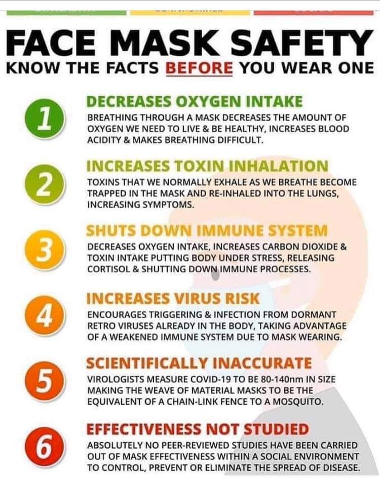 3. Wearing a face mask shuts down immune system. It decreases oxygen intake, increases carbon dioxide and toxin intake putting the body under stress, releasing cortisol and shutting down immune processes.