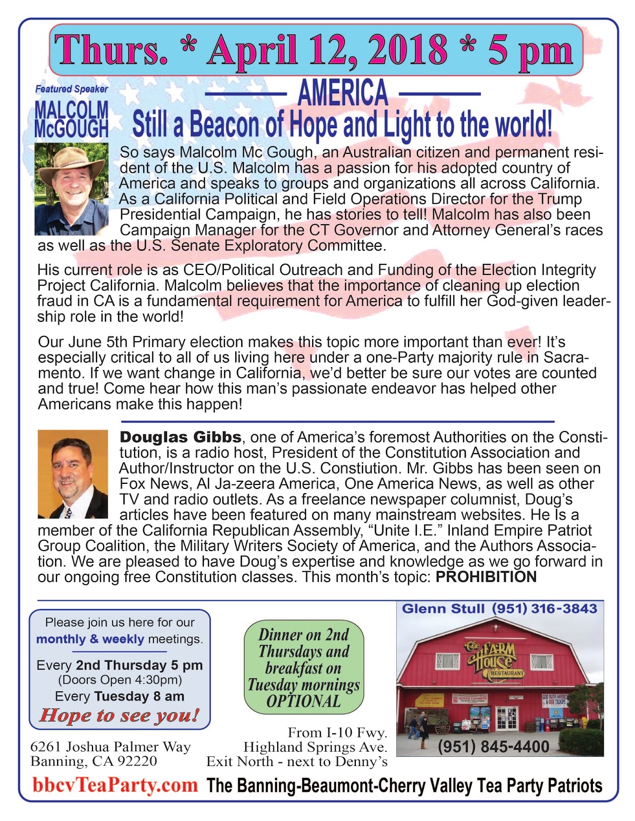 I cancelled my Tuesday Morning Breakfast I spend with the Banning-Beaumont-Cherry Valley Tea Party each week. I cancelled a pre-record of the Conservative Voice Radio program, leaving the ladies of the team to go it alone. I cancelled my Tuesday Night Constitution Class I teach in Corona. I cancelled my weekly Wednesday Constitution Association executive board meeting, and I nearly cancelled tonight’s event in Banning, where after Malcolm McGough speaks to the Tea Party, I am going to give a presentation about constitutional authorities.