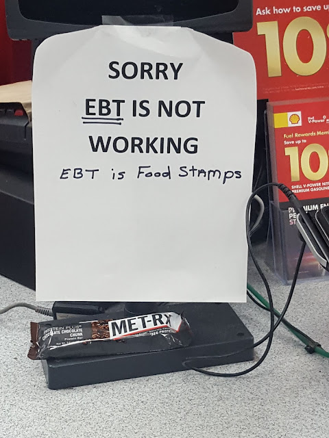 Notice that the clarifying statement at the bottom of the sheet of paper designed to help folks understand that EBT is food stamps was added by pen later, after the sign was printed. This tells me that someone tried to use their EBT card, and when they were told the system was down and the employee pointed at the sign, the person with the welfare item in their hand said something like, “But, I have food stamps.”