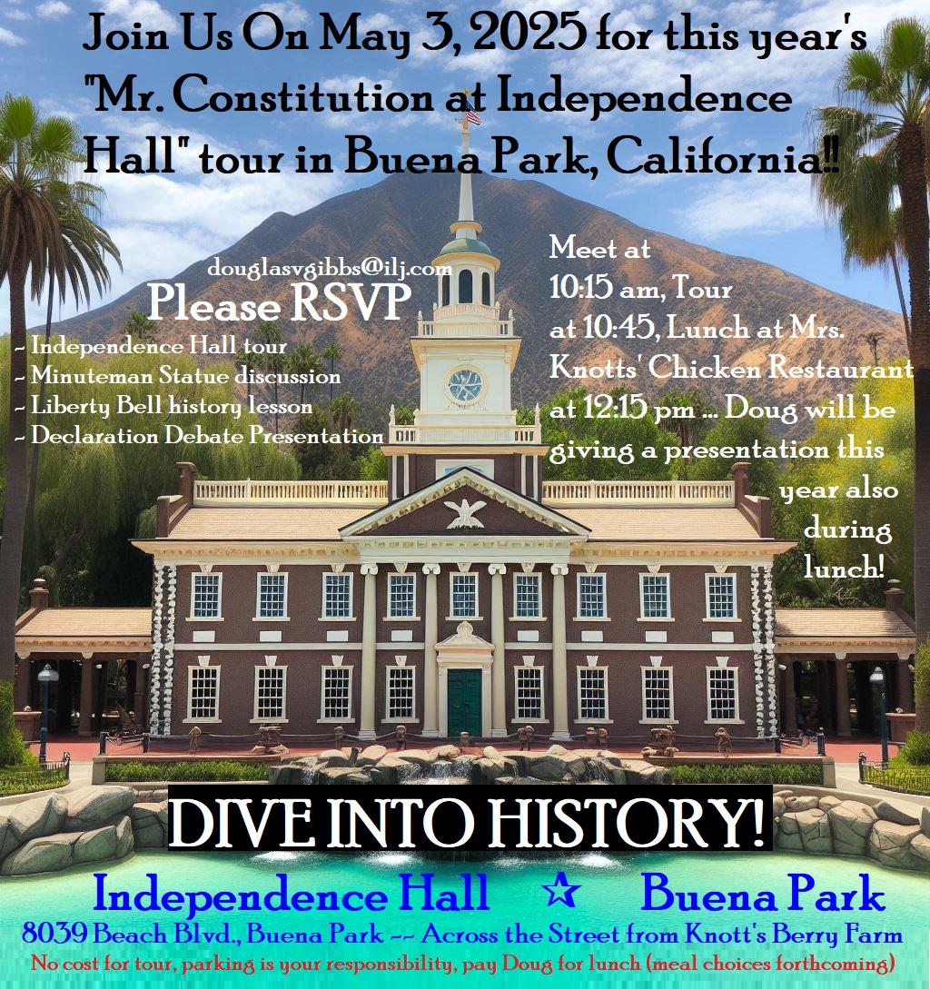 I will be in town for our annual tour of Independence Hall at Knotts in Buena Park, followed by a lunch and a presentation by me regarding the Constitution and Trump’s Presidency…but I need to know who’s coming!