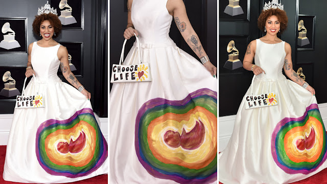 The rising star in the music industry, Joy Villa, was smiling from ear to ear (as she did last year in her MAGA dress) as she stepped out on the Grammy red carpet in her wedding gown.  Her dress was painted with a rainbow adorned baby in the womb and the words “choose life” on her purse.