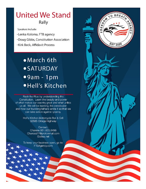 March 6, 2021 I will be one of three speakers at Hell’s Kitchen up on the Ortega Highway above Lake Elsinore. It’s a reasonable drive from both Riverside and Orange Counties. Let’s celebrate America, the Constitution, and remind everyone that we have the freedom to breath…the face coverings being required in our society in the name of a pandemic are oppressive, and a method designed to demean members of our country. You know, like the women in the Islamic world. Join us on Saturday, beginning at 9:00 am, to rally, protest, and hear not only myself, Douglas V. Gibbs (Author, Speaker, Instructor, Radio Host), but also: