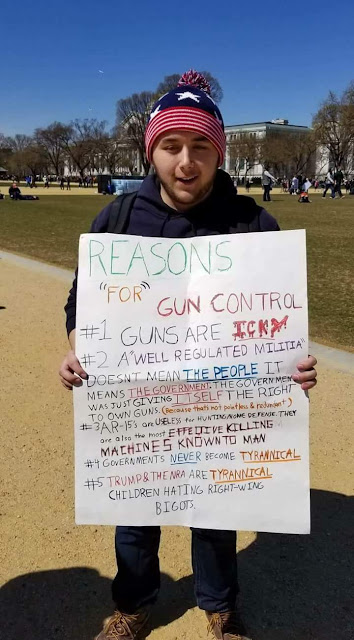This one actually shows how disingenuous this kid really is.  He knows the reason behind the 2nd Amendment.  He understands it is for defending against our own government should it become tyrannical.  Then, with the next reason on his list, the cognizant dissonance kicks in, again.
