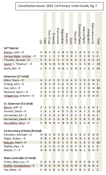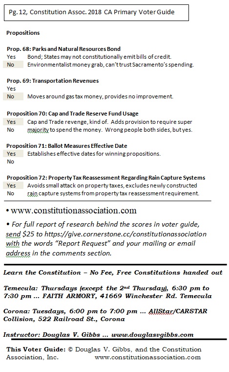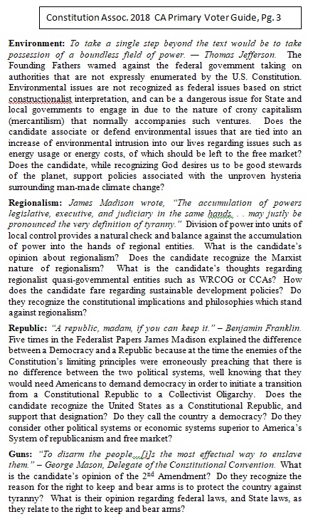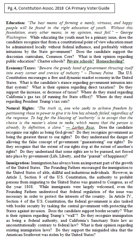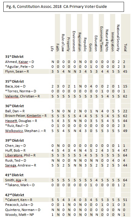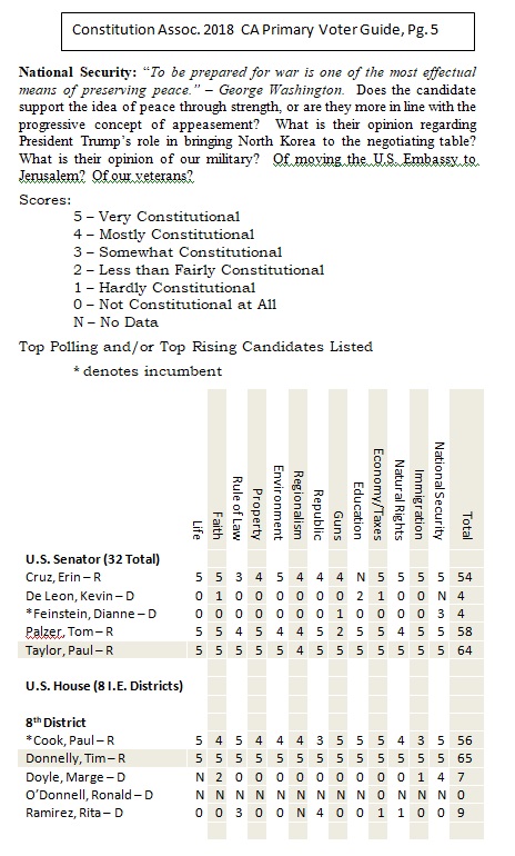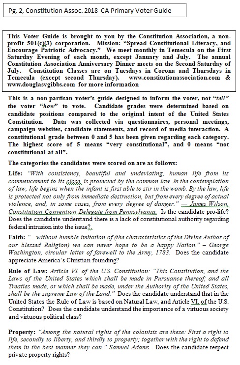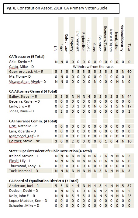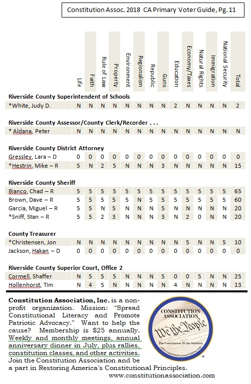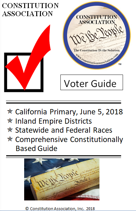 Riverside County and San Bernardino County Voter Guide for California’s Primary Election, June 5, 2018. The following is a non-partisan voter guide based on Constitutional Scores. Offices included in this guide includes: U.S. Senator, U.S. House of Representatives, State Offices and County Offices (County Supervisor positions are not listed in this guide. Due to the non-partisan nature of the office, political stances on nearly every category were not available). For this page’s purposes, based on conversations with the candidates, the following are our recommendations relating to county supervisor seats up for election:
