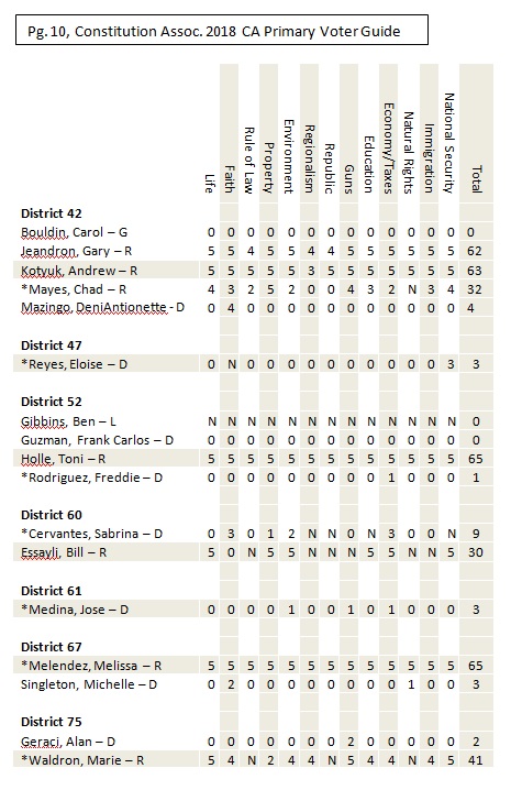 Riverside County and San Bernardino County Voter Guide for California’s Primary Election, June 5, 2018. The following is a non-partisan voter guide based on Constitutional Scores. Offices included in this guide includes: U.S. Senator, U.S. House of Representatives, State Offices and County Offices (County Supervisor positions are not listed in this guide. Due to the non-partisan nature of the office, political stances on nearly every category were not available). For this page’s purposes, based on conversations with the candidates, the following are our recommendations relating to county supervisor seats up for election: