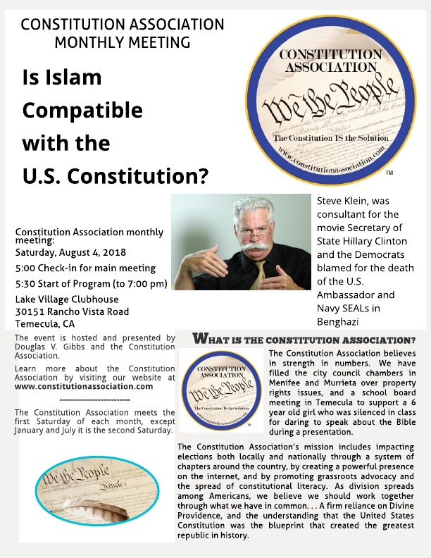 We explore the question of if Islamic Law can co-exist with the United States Constitution when speaker Steve Klein joins our meeting on Saturday to discuss this very question.  See flyer:
