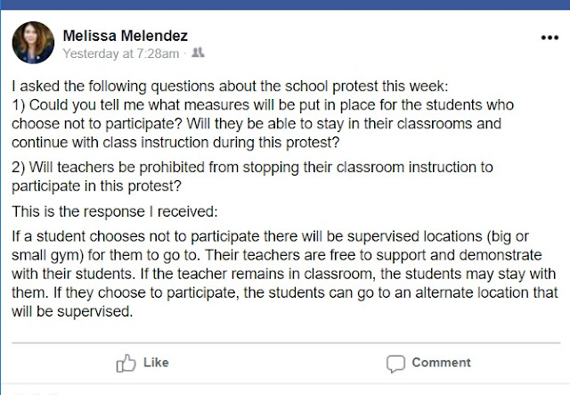 Melissa Melendez is my assemblywoman in Sacramento. She is, in my opinion, the most conservative member of the entire California State legislature. When the Democrats voiced their approval of anti-gun minor children walking out of school to protest, this was her response: