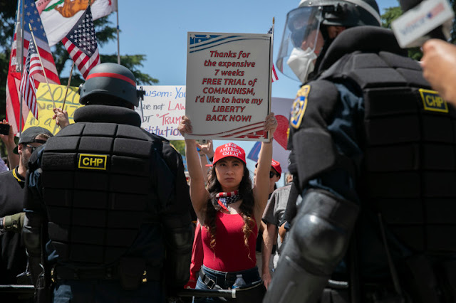 One may see this as a great Tea Party moment, but in California, changing Newsom’s mind with protests may prove to be a tall order.  In California less than one-quarter of voters are registered Republican and the GOP hasn’t won a statewide office in 14 years.  Recent polling shows Californian adults largely happy with how Newsom has handled the pandemic — 71% gave him high marks in a survey conducted by Northeastern, Harvard and Rutgers universities in the second half of April. Only 34% said the same about President Donald Trump.  Asked about the state government’s response, 78% of Californians said the state was “reacting about right.” Only 13% said the state was “overreacting.” And a mere 8% agrees with me and said that the country as a whole should end social distancing measures “immediately.”