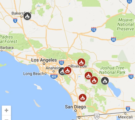 ● Cranston Fire: More than 13,000 acres have burned in this fire near the mountain community of Idyllwild in the mountains above the San Jacinto Valley, and west of Palm Springs. The fire is in its fourth day of life. Five homes have been destroyed, and 7,000 people have been evacuated from the area. The heat from the last few weeks has died down, helping the 1,300 firefighters on the scene. ABC7