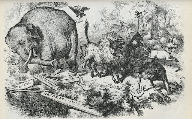 As for the Republican Elephant, it’s been around for quite a while. It began as a political cartoon smashing forward during the era of Abraham Lincoln. . .