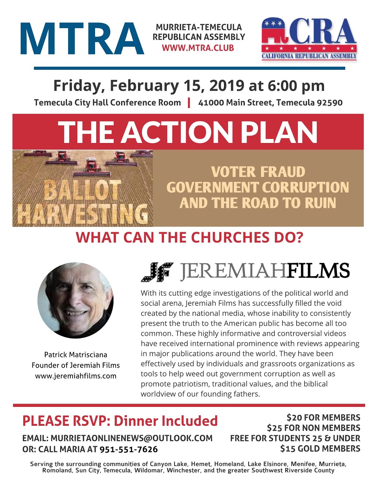 Next week, Friday the 15th of February, Ballot Harvesting will be the front and center discussion at the Murrieta-Temecula Republican Assembly meeting.  Be sure to RSVP.