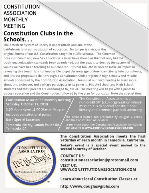 Come one, come all. It isn’t just for the kids. I want middle school and high school kids (and their parents) in attendance on Saturday, but it is important for all constitutionalists to be there. I want you to be there. Help us launch our Constitution Club program. Help us spread constitutional literacy through education into our public schools. Attend our special meeting on Saturday at 3:00 pm at Temecula’s Ronald H. Roberts library at 30600 Pauba Road in Temecula. Doors open at 2:30, and we will hold a special half hour panel discussion from 3:30 before getting into our constitutional literacy offensive into the public school system via Constitution Clubs. There is no cost to attend.