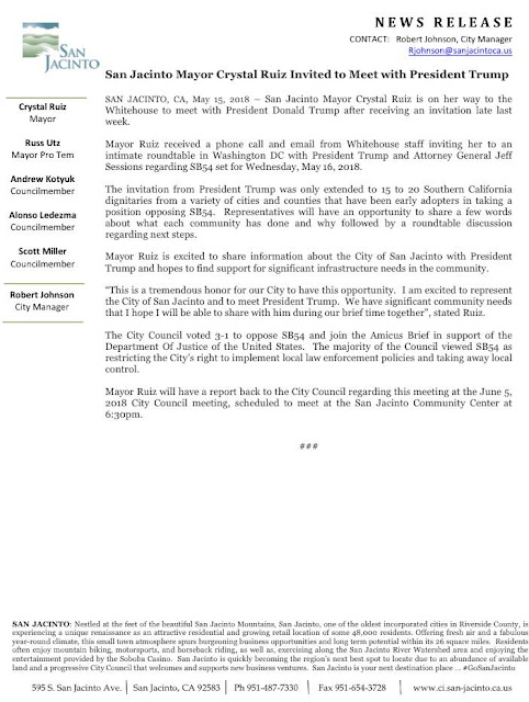 While on the phone with the Mayor of San Jacinto, last week, when I asked about if her call was regarding San Jacinto’s opt-out decision, Crystal said, “No, this is bigger.  I’ve been invited to the White House to be a part of a round-table discussion with 15 mayors, and President Donald Trump.  I won’t be able to take anything with me into the room, so I need help making sure I’ve got all of this information down in my memory.”