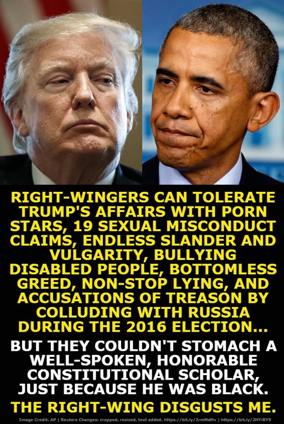 I saw a meme not too long ago from a liberal left Democrat that read the following.  “Right-wingers can tolerate Trump’s affairs with porn stars, 19 sexual misconduct claims, endless slander and vulgarity, bullying disabled people, bottomless greed, non-stop lying, and accusations of treason by colluding with Russia during the 2016 Election … but the couldn’t stomach a well-spoken, honorable constitutional scholar, just because he was black.  The right-wing disgusts me.”